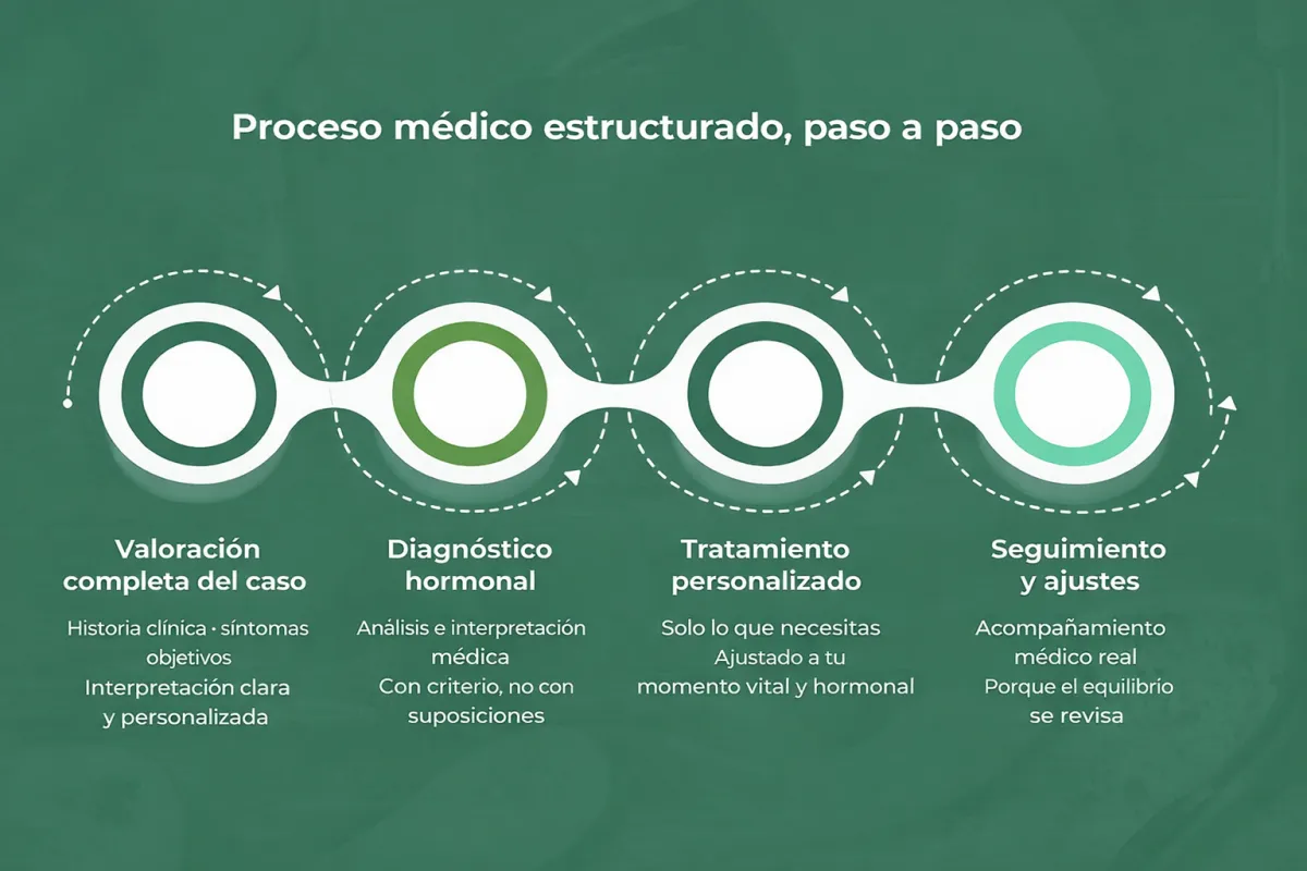 Analizamos tu situación hormonal con criterio médico, interpretamos tus síntomas y diseñamos un plan personalizado con seguimiento real.